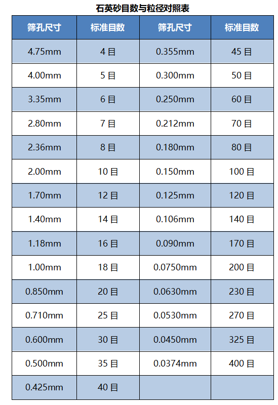 石英砂目數其實指的是石英砂粒徑或者粗細度,一般指的是在1英寸X1英寸的面積內的篩網,能通過該篩網孔數就定義為目數。石英砂目數越大,說明石英砂粒度越細,目數越小,說明石英砂的粒度越大。