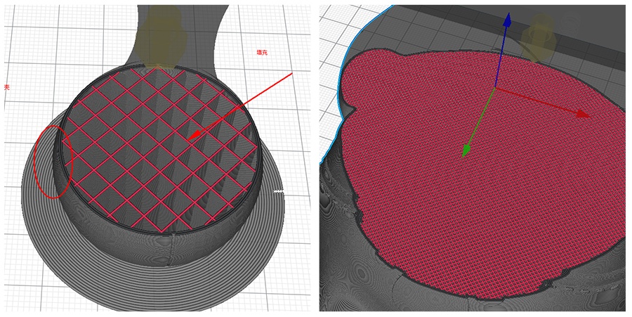 下圖中,產品模型外殼由材料A打印,填充由材料B打印。