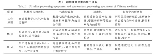 超細(xì)中藥制備方法分為物理法和化學(xué)法兩種,而超細(xì)粉碎工藝屬于物理法。超細(xì)中藥粉碎工藝是傳統(tǒng)工業(yè)粉碎與中藥特性相結(jié)合而形成的加工工藝[4],而傳統(tǒng)的工業(yè)粉碎主要為三類:機(jī)械沖擊粉碎法、氣流粉碎法和球磨法。表2為超細(xì)中藥加工設(shè)備同其他傳統(tǒng)設(shè)備的對比。