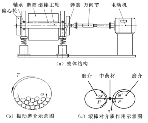 對待粉磨的物料即中藥材原料,在外界旋轉(zhuǎn)動(dòng)力T及震力的作用下,研磨介質(zhì)(簡稱磨介,即滾棒)做時(shí)而散開、時(shí)而聚合的上拋運(yùn)動(dòng),滾棒自身做同向自轉(zhuǎn),速度為ω′,滾棒群做公轉(zhuǎn),速度為ω,通過內(nèi)外層的滾棒不斷交換位置,兩兩滾棒不斷沖撞、擠壓剪切中藥材物料,使物料被擠破剪斷。在破碎過程中大顆粒受力先被破碎,顆粒從大到小不斷地被破碎。整個(gè)破碎過程在-10℃的低溫環(huán)境中進(jìn)行,使堅(jiān)韌性中藥材變成易粉碎的濕脆體,提高了粉碎效率,且低溫條件下的這種粉磨方式可有效防止加工過程成分揮發(fā)或氧化,保證藥性不受損失。設(shè)備結(jié)構(gòu)及原理簡圖如圖3所示。P為擠壓力,τ為剪切力。