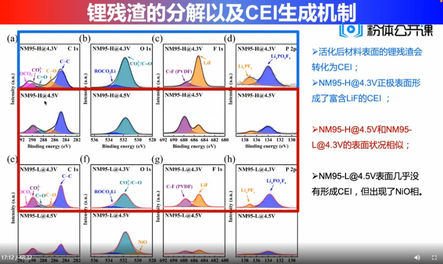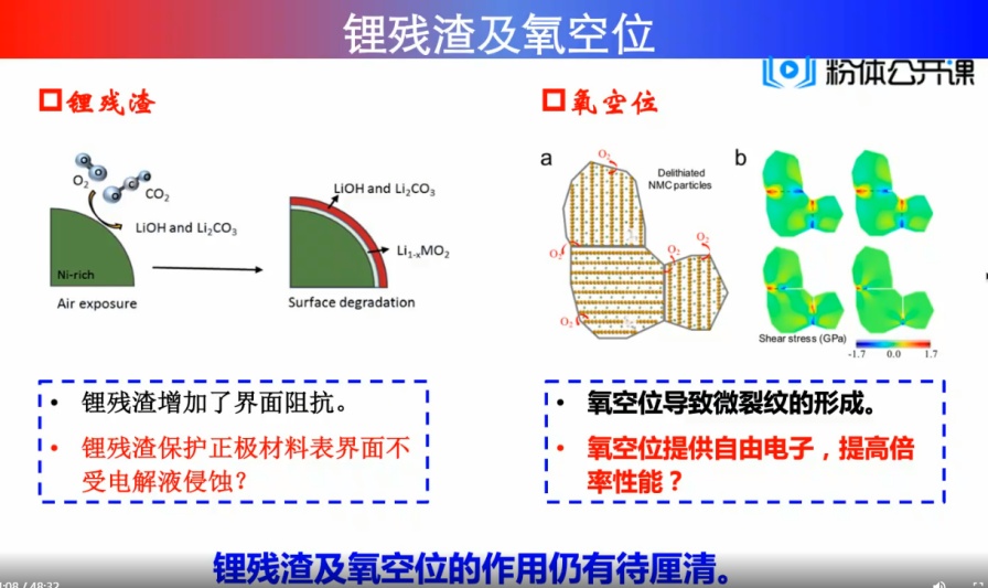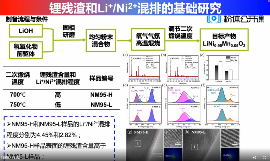 李靈均在報告中從高鎳正極材料概況、高鎳正極材料基礎研究、高鎳正極材料改性三個方面就鋰離子電池高鎳正極材料的基礎研究及改性策略問題進行講解。高鎳正極材料相較于傳統正極材料具有可逆容量高、工作電壓高、低Co、低成本的優勢,但也存在結構穩定性差、表面化學穩定性差問題。對于鋰殘渣及氧空位,研究表明,隨著氧通量增加,材料Li/Ni混排下降,氧空位含量下降,表面鋰殘渣量減少。氧空位主要影響材料的循環性能,當氧空位含量低于8.5%時,氧空位越少,結構及熱穩定性越好,循環性能越優異。對于鋰殘渣和Li+/Ni2+混排對循環穩定性能的影響,在2.7-4.3V時,殘余鋰轉變為CEI,有利于增強材料在循環過程的表界面穩定性,但犧牲了材料的倍率性能;有序的Li+/Ni2+混排可抑制相變和微裂紋的形成,增強循環性能,但是犧牲了材料的容量。對于高鎳正極材料的表面薄覆改性,李靈均講解了LiAiO2原位修飾技術以及LiAiO2&LixTi2O4原位雙重修飾技術,并對相關專利技術進行介紹。此外,他還系統介紹了包覆與摻雜雙重修飾改性高鎳正極材料,以及相關研究成果的產業化進展。報告結束后,李靈均對參會人員提出的疑惑、問題進行了交流、解答。