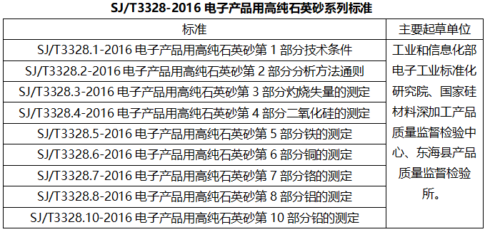 此外,行業標準SJ/T3328-2016電子產品用高純石英砂標準中規定了電子產品的技術條件、分析方法通則、灼燒矢量的測定、二氧化硅的測定、鐵的測定、銅的測定、鉻的測定、鋁的測定以及鉛的測定。
