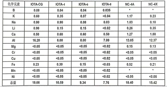 UNIMIN和TQC產高純石英砂的雜質元素含量(ppm)