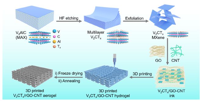 圖13D打印V2CTx/rGO-CNT微網格氣凝膠電極的制備過程