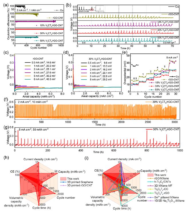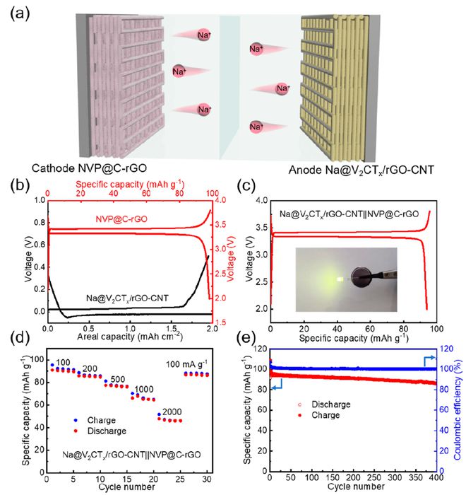 近日,鄭州大學王燁教授、徐俊敏副教授、新加坡科技設計大學(SUTD)楊會穎副教授通過直接墨寫3D打印技術制備了一種人工三維分級多孔親鈉性V2CTx/rGO-CNT微網格氣凝膠,并進一步將其用作Na金屬的基體以獲得Na@V2CTx/rGO-CNT鈉金屬負極。實驗顯示,V2CTx/rGO-CNT電極可在2mAcm-2、10mAhcm-2下產生超過3000小時的優異循環壽命,平均庫侖效率為99.54%。更有吸引力的是,它甚至可以在5mAcm-2和50mAhcm-2的超高面容量下穩定運行超過900小時。此外,將Na@V2CTx/rGO-CNT負極與Na3V2(PO4)3@C-rGO正極配對的全電池可在100mAg-1下循環400次后提供86.27mAhg-1的高可逆容量?傊,這項工作不僅闡明了親鈉性V2CTx/rGO-CNT微網格氣凝膠電極上優異的鈉沉積化學,而且還提供了一種通過3D打印方法制備先進鈉金屬負極的方法。