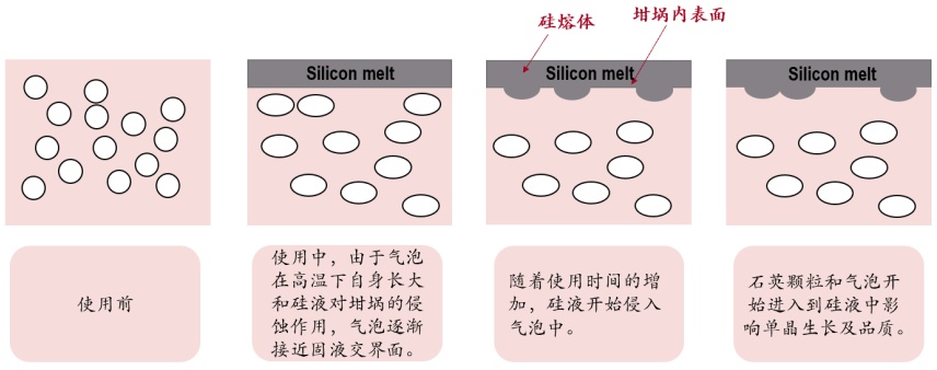 氣泡(氣體包裹體)含量:氣泡(氣液包裹體)主要由結(jié)晶水和氣組成,氣的成分主要有CO2、H2O、H2O2、N2、CH4、CO。在坩堝使用過程中,由于與硅液接觸的內(nèi)表面不斷向硅液中熔解,并且伴隨著透明層中的微氣泡不斷的長大,靠近最內(nèi)表面的氣泡破裂,伴隨著硅液釋放石英微顆粒以及微氣泡。而這些雜質(zhì)會以微顆粒以及微氣泡的形式伴隨著硅液流遍整個硅熔體,直接影響到硅的成晶(整棒率、成晶率、加熱時間、直接加工成本等)以及單晶硅的質(zhì)量(穿孔片、黑芯片等)。目前,通過使用低氣泡密度的高純度石英砂作為石英坩堝的內(nèi)層,可有效減少內(nèi)表面氣泡破裂現(xiàn)象,為長時間拉晶(如多次復(fù)投料)提供保障。