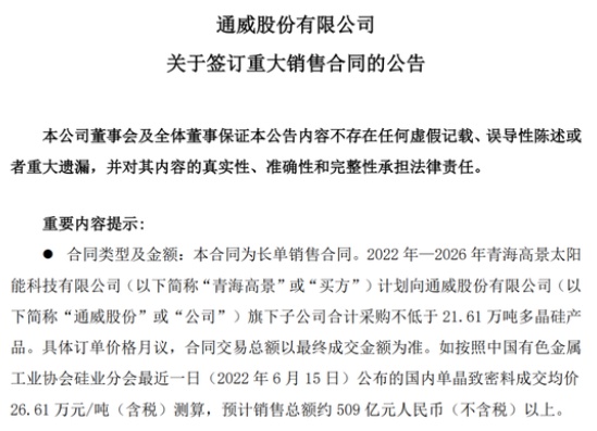 中國粉體網訊  6月18日,通威股份有限公司(以下簡稱“通威股份”)發布關于簽訂重大銷售合同的公告。公告稱,2022年—2026年青海高景太陽能科技有限公司(以下簡稱“青海高景”)計劃向通威股份有限公司旗下子公司合計采購不低于21.61 萬噸多晶硅產品。具體訂單價格月議,合同交易總額以最終成交金額為準。