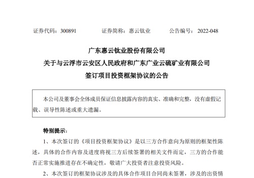 6月20日晚間,惠云鈦業(yè)(300891)公告稱(chēng),公司與云浮市云安區(qū)人民政府、廣東廣業(yè)云硫礦業(yè)有限公司簽訂了《項(xiàng)目投資框架協(xié)議》,擬建設(shè)100億元投資規(guī)模新能源材料產(chǎn)業(yè)園,并在生產(chǎn)研發(fā)、重大項(xiàng)目建設(shè)、市場(chǎng)推廣等相關(guān)領(lǐng)域開(kāi)展合作。