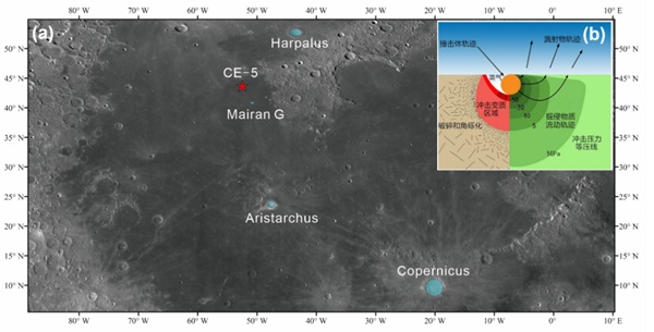 圖1.(a)嫦娥五號著陸點、Mairan G、Aristarchus、Harpalus和Copernicus撞擊坑位置;(b)撞擊坑形成示意圖