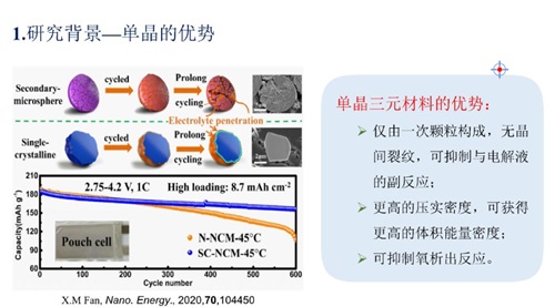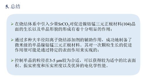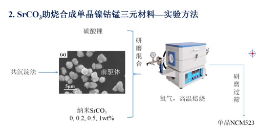 為了追求更高的性能,高鎳三元正極材料的Ni含量不斷增加,但是隨之而來的問題隨之加劇。為了改善材料的性能,來自中南大學的杜柯教授首先跟我們分享了單晶鎳鈷錳三元材料的制備及改性研究。單晶化是針對高鎳三元材料二次顆粒易破碎、粉化,易與電解液發生反應而提出的改性策略。但是常用單晶制備方法:高溫燒結法和熔鹽輔助法都無法避免水洗+二次燒結處理,增大了成本。為此,杜教授實驗室利用碳酸鍶助燒合成單晶鎳鈷錳三元材料,并詳細分析了用此方法制備的三元材料的結構、形貌、電化學性能等不同實驗指標,以及不同助燒劑對材料制備的影響,證實在燒結體系中引入碳酸鍶對促進鎳鈷錳三元正極材料晶面的生長及單晶形貌的形成有十分明顯的作用。