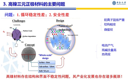 三元正極材料自從1999年被報道以來,其種類和性能都得到了快速發展!尤其高鎳三元材料優勢顯著,受到了極大關注和廣泛研究。中南大學的唐有根教授分別從三元材料的發展、高鎳三元正極材料面臨的主要問題、高鎳三元材料的改性研究、以及圍繞高鎳三元材料所做的一系列工作,展現了高鎳三元材料的研究熱點,指明了高鎳三元正極材料是高能量密度鋰離子動力電池的發展方向。