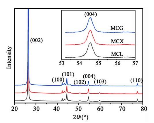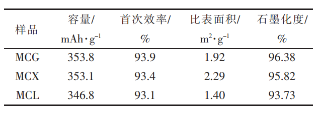 研究者以油系針狀焦粉為原料,通過表面改性預處理,來制備人造石墨。分別在坩堝爐、箱體爐以及連續式石墨化爐中對針狀焦粉進行石墨化,取得三種樣品,并記作MCG(坩堝爐樣品)、MCX(箱體爐樣品)、MCL(連續式石墨化爐樣品)。之后,對三種樣品分別進行石墨化度測試、比表面積測試、容量和效率測試,并從石墨化度、容量、比表面積、石墨化均勻性四個角度做對比分析。