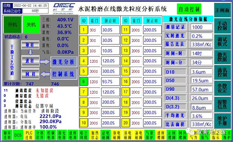 歐美克在線粒度檢測控制系統由創新的代表性取樣裝置、加樣量精密可控的樣品縮分裝置,高性能干法激光粒度分析儀、避免堆料的二級回樣裝置及自動化控制總成和數據實時顯示裝置組成。