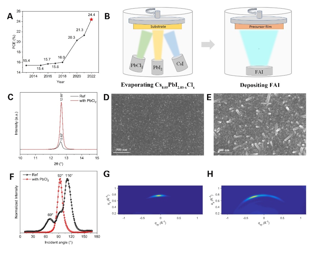 鑒于此,電機系易陳誼課題組提出了一種氯元素合金化的真空蒸鍍工藝,用于制備高效率大面積鈣鈦礦太陽能電池。XRD、SEM和GIWAXS測試表明,在前驅體薄膜中引入氯元素可以形成多元合金(Cs0.05PbI2.05-xClx),使前驅體薄膜具有垂直于基底生長的擇優取向和更強的結晶性。原位GIWAXS和原位GIXRD測試表明,氯元素的摻雜可以顯著加速FAI分子在碘化鉛(PbI2)晶格中的擴散速度、促進δ相甲脒鉛碘(δ-FAPbI3)轉變為α相(α-FAPbI3),以及顯著提升FAPbI3的結晶性。此外,基于氯代合金介導的真空蒸鍍工藝制備的鈣鈦礦太陽能電池具有更低的缺陷密度和更低的非輻射復合損失。