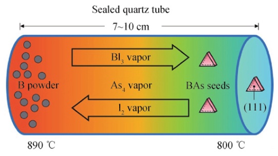 BAs晶體難以制備主要受到以下因素影響:(1)硼的熔點(2076℃)遠高于砷的升華溫度(614℃);(2)砷及相關反應物具有毒性;(3)硼的化學穩定性很強,很難反應;(4)生長溫度超過920℃時BAs會分解為更加穩定的亞晶相(B12As2)。因此很難像GaAs等其他Ⅲ-Ⅴ族半導體材料那樣采用熔體法進行晶體生長。CVT可在密閉環境下通過多溫區精確控溫實現化學反應控制,有效解決了上述問題,是目前開展BAs單晶制備研究的主要方法。