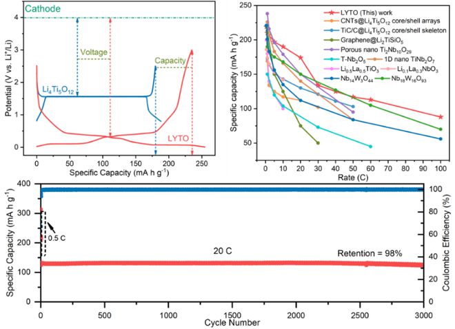 作為鋰電負極,鈦酸釔鋰的平均工作電壓為0.3Vvs.Li+/Li,可逆比容量達到230mAhg-1,更低的工作電壓和更高的比容量使得鈦酸釔鋰電池能量密度數倍于鈦酸鋰電池。此外,鈦酸釔鋰具有出色的倍率性能和循環穩定性,其倍率比容量超過了大多數已報道的鈦基負極材料,在20C(1C=200mAg-1)下循環3000次后容量保持率高達98%。