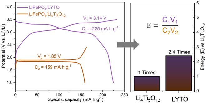 另外,在匹配磷酸鐵鋰(LiFePO4)正極后,鈦酸釔鋰全電池的能量密度為磷酸鐵鋰/鈦酸鋰全電池的2.4倍(圖4),進一步表明鈦酸釔鋰作為低電壓、高倍率負極材料的潛在應用價值。
