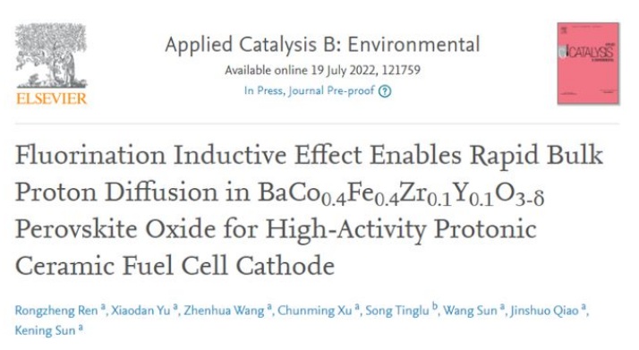 中國粉體網(wǎng)訊 近日,北京理工大學(xué)孫克寧教授團(tuán)隊在質(zhì)子陶瓷燃料電池氧電極材料設(shè)計方面取得新進(jìn)展,相關(guān)研究成果以“Fluorination Inductive Effect Enables Rapid Bulk Proton Diffusion in BaCo0.4Fe0.4Zr0.1Y0.1O3-δ Perovskite Oxide for High-Activity Protonic Ceramic Fuel Cell Cathode”為題發(fā)表在國際期刊Applied Catalysis B: Environmental上(IF="24.319),北京理工大學(xué)為唯一通訊單位,化學(xué)與化工學(xué)院孫克寧教授和王振華教授為文章共同通訊作者,博士后任戎征為該論文的第一作者。
