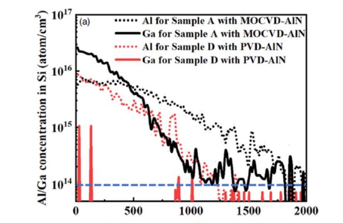 但是如果采用MOCVD的方法生長氮化鋁種子層,由于設備腔體中殘余的鎵原子會擴散到高阻硅中,造成射頻損耗,對GaN-on-Si射頻器件的功率增益和功率輸出有不利影響。為了解決這個問題,采用PVD物理氣相沉積工藝制備氮化鋁可以有效防止鎵-硅回熔現象的發生。然而,用濺射AIN在Si襯底上獲得高質量且無裂紋的GaN層是一個關鍵難題。