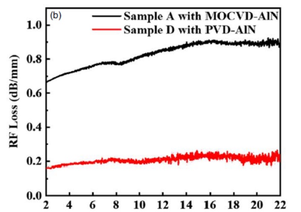 (b) 在 PVD-AlN 和 MOCVD-AlN 上生長的 GaN 層的射頻損耗