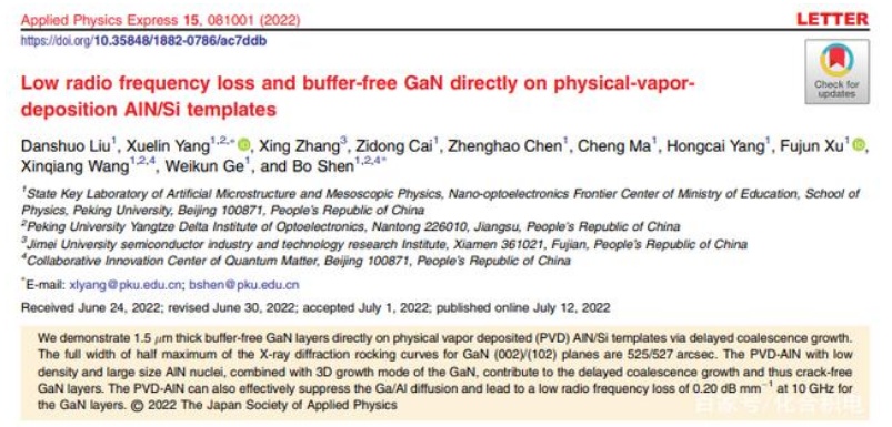 化合積電采用PVD物理氣相沉積工藝制備出高質量的氮化鋁種子層,為有效生長高質量的氮化鎵打下良好基礎,同時,顯著降低了射頻損耗。這一重要研究成果,以“Low radio frequency loss and buffer-free GaN directly on physical-vapor-deposition AlN/Si templates”為題,發布在Applied Physics Express期刊上。論文第一作者是北京大學博士生劉丹碩,共同作者有北京大學沈波教授、楊學林教授及化合積電聯合創始人/CEO張星等。