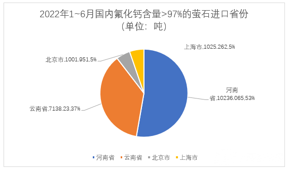 2022年1~6月,國內(nèi)按重量計氟化鈣含量>97%的螢石總進口量為19401.710噸。主要進口國家:墨西哥12248.236噸、緬甸7138.230噸。