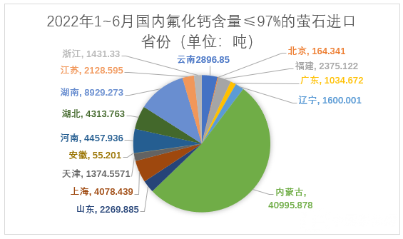 另一方面,按重量計氟化鈣含量≤97%的螢石總進口量為89998.221噸。主要進口國家:蒙古65317.217噸、尼日利亞13531.010噸、南非5006.938噸、泰國2701.005噸、贊比亞2089.160噸、巴基斯坦571.131噸、緬甸478.640噸等。