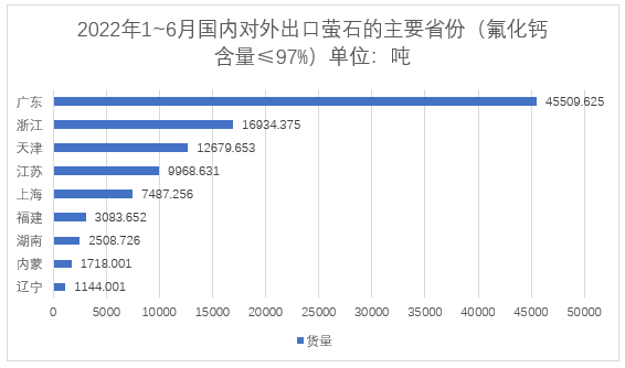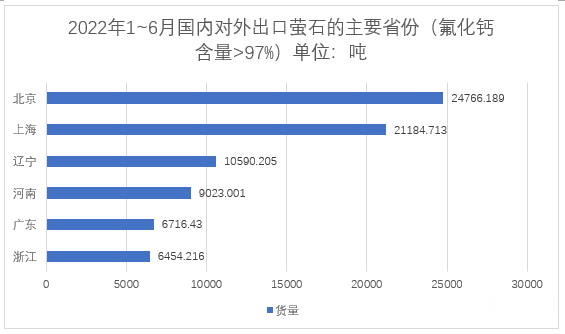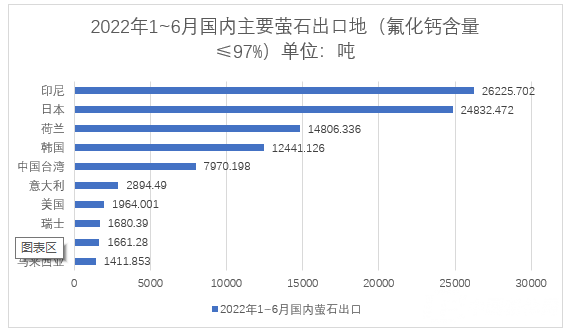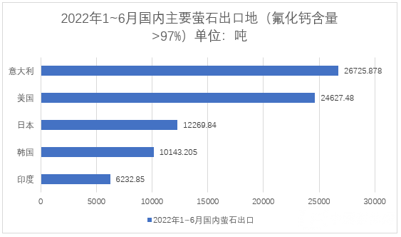 2022年1~6月,國內(nèi)按重量計氟化鈣含量>97%的螢石總出口量81026.683噸。主要出口面向國家:印度6232.850噸、日本12269.840噸、韓國10143.205噸、意大利26725.878噸、美國24627.480噸等。