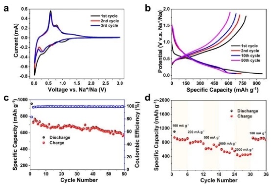 作者合成了GeP5/C復合材料,并采用多模型表征技術對鈉的儲存機理進行了綜合研究。基于轉化和合金化的多步反應過程提供了947mAh/g的高初始容量。放電產物NaxP和NaGe的協同作用增強了電化學性能以及結構和形態的穩定性。經過60次循環后,GeP5/C復合電極即使在1000mA/g的高電流密度下,鈉的存儲容量也顯示為578mAh/g。這些結果為了解P基負極的鈉離子儲存機理提供了基礎知識,并為開發先進的SIBs負極材料提供了有價值的信息。