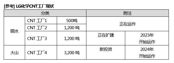 LG化學于2017年首次啟動第一座500噸規模的CNT工廠。進入2020年,隨著CNT市場不斷擴大,每年都在擴建CNT工廠。