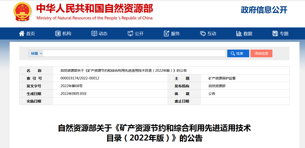 中國粉體網訊 近日,自然資源部發布公告稱,為加快礦產資源節約和綜合利用先進適用技術推廣應用,切實發揮技術政策的引導作用,自然資源部組織開展了新一輪礦產資源節約和綜合利用先進適用技術目錄評選更新工作。經自愿申報、省級自然資源主管部門及有關單位推薦、專家評選、社會公示等程序,遴選產生了《礦產資源節約和綜合利用先進適用技術目錄(2022年版)》,并予以公告。