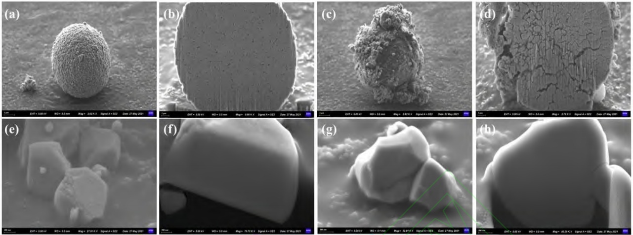 多晶811和單晶C811的SEM及FIB-SEM圖。(a-d)多晶;(e-h)單晶(來(lái)源:王婷等,《多晶及單晶NMC811材料力學(xué)性能分析》)