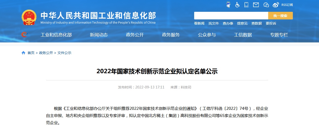 中國粉體網(wǎng)訊  近日,工信部科技司發(fā)布公告,根據(jù)《工業(yè)和信息化部辦公廳關(guān)于組織推薦2022年國家技術(shù)創(chuàng)新示范企業(yè)的通知》(工信廳科函〔2022〕74號(hào)),經(jīng)企業(yè)自主申報(bào)、地方和央企組織推薦以及專家評(píng)審,擬認(rèn)定中國北方稀土(集團(tuán))高科技股份有限公司等65家企業(yè)為國家技術(shù)創(chuàng)新示范企業(yè)。