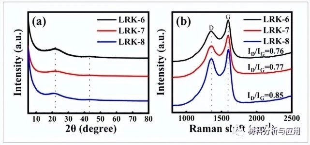 圖1 (a)XRD圖案和(b)LRK-6、LRK-7和LRK-8材料的拉曼光譜