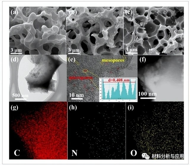 圖2 (a)LRK-6、(b)LRK-7和(c)LRK-8的SEM圖像;(df)LRK-7的TEM圖像;(gi)LRK-7的C、N和O的相應EDS映射