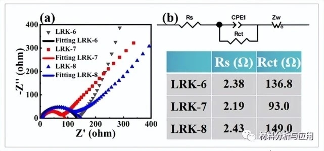 圖5 (a)LRK-6、LRK-7和LRK-8的典型奈奎斯特曲線,(b)LRK-6、LRK-7和LRK-8的模擬等效電路圖和擬合數(shù)據(jù)