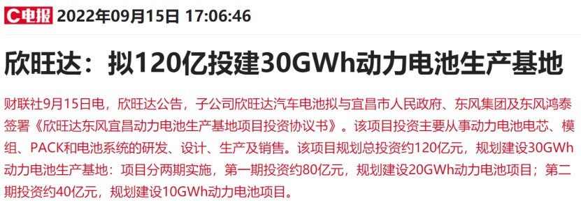 中國粉體網訊 9月15日下午,總市值超400億元的欣旺達發布公告,子公司欣旺達汽車電池擬與宜昌市人民政府、東風集團及東風鴻泰簽署《欣旺達東風宜昌動力電池生產基地項目投資協議書》。該項目投資主要從事動力電池電芯、模組、PACK和電池系統的研發、設計、生產及銷售。
