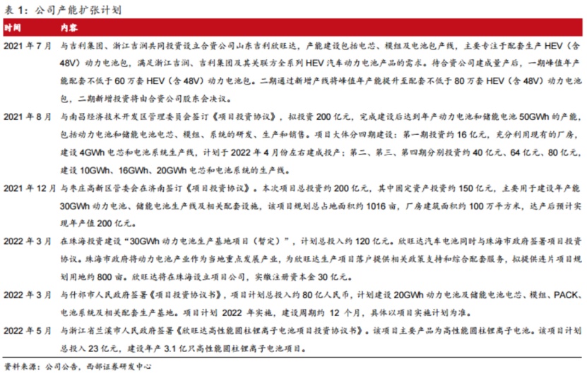 產能方面,西部證券楊敬梅在9月6日研報中表示,公司陸續在南昌、棗莊等地進行大規模動力電池產能布局。截至目前,欣旺達共落子珠海、惠州、南京、南昌、棗莊、什邡六大動力電池生產基地,合計總投資達770億元,將新增產能160GWh。華泰證券申建國、邊文姣在8月28日研報中預測到2022年底公司動力電池產能可達40GWh。