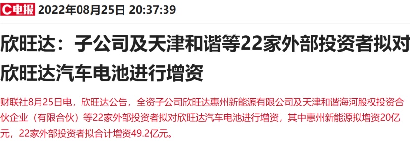 此外,欣旺達在8月25日公告,全資子公司惠州新能源及天津和諧等22家外部投資者,擬對子公司欣旺達EVB進行增資。而就在此公告前十天,有媒體披露欣旺達EVB完成新一輪融資,超出了此前規劃的30億元募資額度一倍以上,投后估值約300億元。