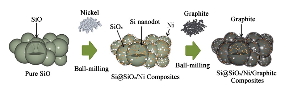 金屬及氧化物復合:Wang等通過兩步球磨法以SiO、金屬鎳粉、石墨等為原料成功制備了Si@SiOx/Ni/G復合負極。金屬鎳顆粒和石墨不僅顯著提高了硅負極的導電性,而且對電極結構具有良好的支撐作用。
