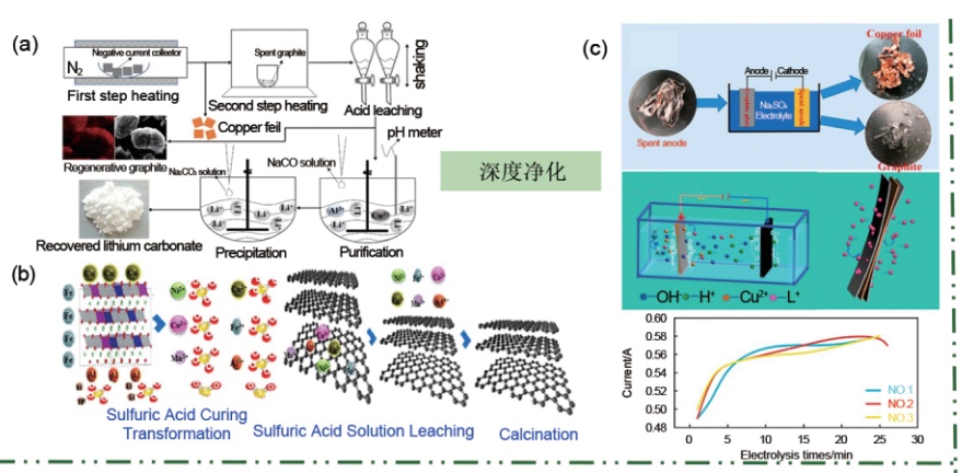 石墨回收方法:(a)無機(jī)酸回收;(b)硫酸固化法;(c)電化學(xué)法(來源:燕喬一等,《鋰離子電池負(fù)極石墨回收處理及資源循環(huán)》)