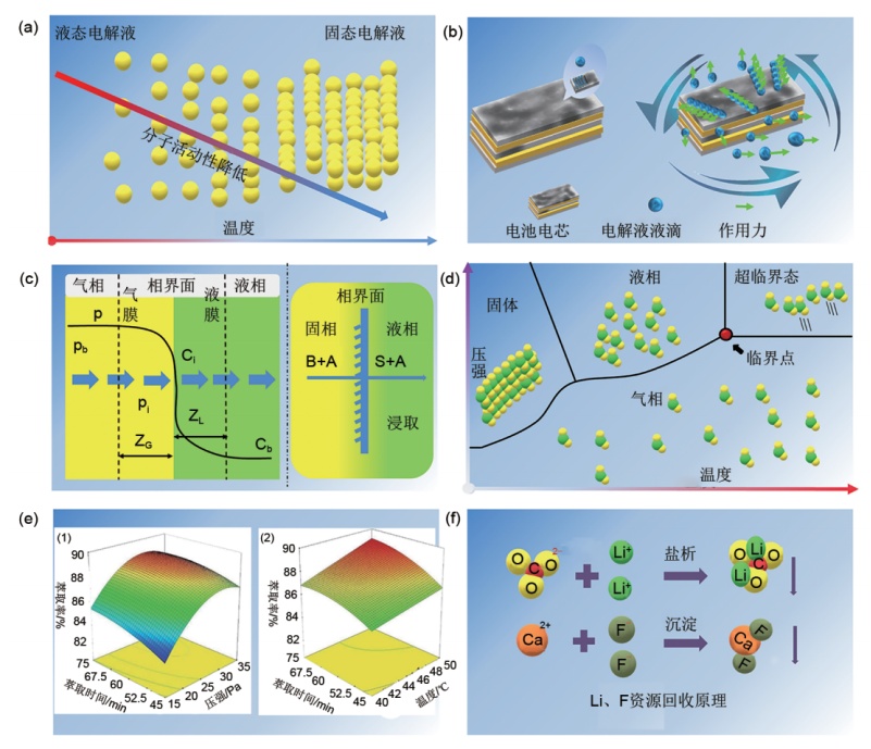 不同電解液回收的機(jī)理示意圖:(a)冷凍法;(b)機(jī)械離心法;(c)有機(jī)溶劑萃取法;(d)、(e)超臨界二氧化碳萃取法;(f)鋰鹽回收方法(來源:張群斌等,《廢舊電池電解液回收及高值化利用研發(fā)進(jìn)展》)