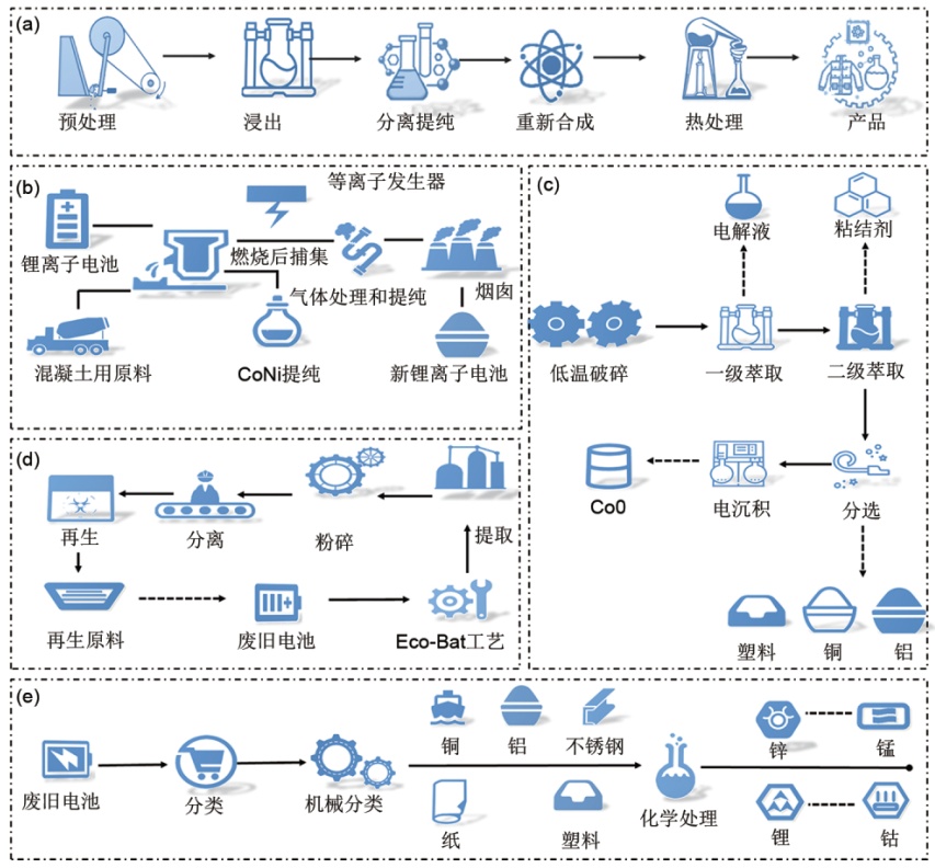 國內(nèi)外企業(yè)回收鋰電池電解液案例:(a)格林美工藝;(b)比利時(shí)Umicore工藝;(c)英國AEA工藝;(d)日本OnTo工藝;(e)法國Recupyl工藝(來源:張群斌等,《廢舊電池電解液回收及高值化利用研發(fā)進(jìn)展》)