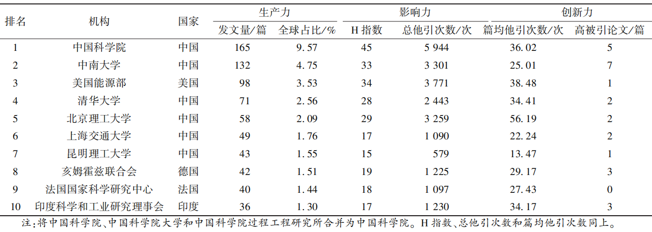 生產(chǎn)力方面,以發(fā)文量和全球占比為衡量指標(biāo),結(jié)果顯示:在前10位主要機(jī)構(gòu)中有6位來自中國。其中,中國科學(xué)院和中南大學(xué)在發(fā)文量和全球占比方面占絕對(duì)優(yōu)勢,處于第一梯隊(duì),成為該技術(shù)發(fā)展的主要發(fā)文力量;美國能源部和德國亥姆霍茲聯(lián)合會(huì)是為發(fā)文量最多的國外機(jī)構(gòu),位居第二梯隊(duì),屬于該技術(shù)發(fā)展的重要發(fā)文力量。