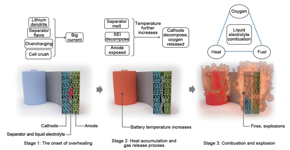 鋰電池熱失控過程的三個階段(來源:歐宇等,鋰離子電池中的智能安全電解液研究進展)
