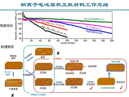層狀氧化物由于具有高理論容量和高空氣穩(wěn)定性,被認為是一種應(yīng)用前景廣闊的高比能鈉離子電池正極材料,然而其實際應(yīng)用卻面臨諸多難題,比如高電壓下會發(fā)生P2到O2的大體積相變和不可逆的氧釋放,導(dǎo)致電池容量和電壓迅速衰減。為了改善材料的性能,來自北京工業(yè)大學(xué)的閆教授首先給我們講述了層狀正極材料中的裂紋失效機制,而通過元素摻雜(Mg摻雜、Zn摻雜)可改變正極材料的循環(huán)穩(wěn)定性,元素摻雜可形成納米沉淀相,通過穩(wěn)定沉淀相增強材料表面穩(wěn)定性。