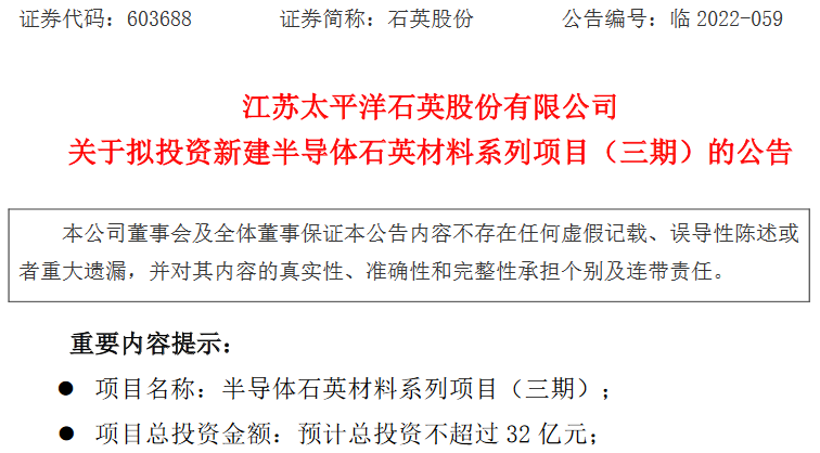 近日,石英股份公告稱,為了抓住光伏及半導體產(chǎn)業(yè)的市場機遇,豐富產(chǎn)品結構,延伸產(chǎn)業(yè)鏈條,增強公司的市場競爭實力,助力公司持續(xù)健康發(fā)展,公司擬投資建設“半導體石英材料系列項目(三期)”,項目建設地點位于東海縣平明鎮(zhèn)內(nèi),經(jīng)初步計算,總投資不超過32億元。公告顯示,本次項目建設內(nèi)容包括6萬噸高純石英砂、15萬噸半導體級高純石英砂、5800噸半導體石英制品,規(guī)劃用地面積約245畝,建設周期三年。32億元總投資中,固定資產(chǎn)投資20.8億元,全額流動資金11.2億元,資金來源為自有資金和自籌資金。