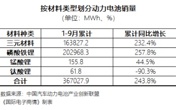 據中國汽車動力電池產業創新聯盟統計的數據顯示,1-9月,中國動力電池產量累計為372.1GWh,累計同比增長176.2%,其中三元電池累計產量150.2GWh,占總產量40.4%,同比累計增長139%;磷酸鐵鋰電池累計產量221.3GWh,占總產量59.5%,累計同比增長209%。