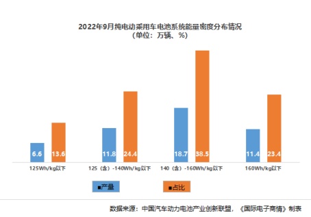 同期,中國純電動乘用車系統密度在140(含)-160Wh/kg和160Wh/kg以上車型產量分別為18.7萬輛和11.4萬輛,占比分別為38.5%和23.4%,125Wh/kg以下車型產量6.6萬輛,占比13.6%。