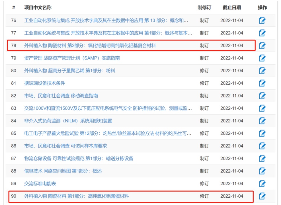 中國粉體網訊 近日,國家標準委決定對182項擬立項推薦性國家標準項目公開征求意見,其中涉及《外科植入物 陶瓷材料 第1部分:高純氧化鋁陶瓷材料》和《外科植入物 陶瓷材料 第2部分:氧化鋯增韌高純氧化鋁基復合材料》等生物陶瓷材料的修制訂。